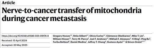 2025年6月底,美国南阿拉巴马大学研究团队,联合美国德克萨斯大学研究团队国际顶尖学术期刊在《 Nature 》发表突破性研究,揭示了神经元通过线粒体转移促进癌症转移的新机制。文章的核心创新点是开发了名为MitoTRACER的遗传报告系统,能够永久标记接收线粒体的癌细胞。