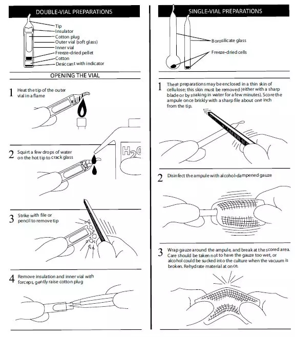 ATCC的菌株大多以冻干粉的形式保存在安瓿瓶中,主要有双管和单管两种形式。如下图所示,双管顾名思义由内外两个管组成。冻干粉位于内管底部,上有棉花塞。外管底部有干燥剂,上有真空密封组件。而单管结构比较简单,冻干粉位于管子底部。