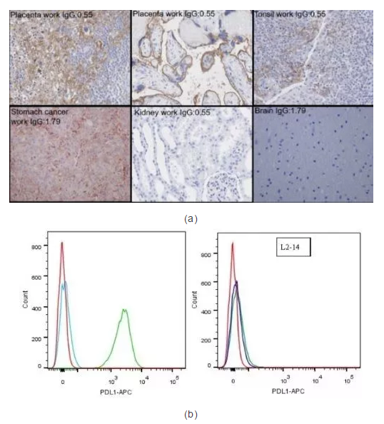 在生理或病理情况下human不同器官中的细胞定位(图1-a);在KO的人肺腺癌细胞L2987 L2-14克隆中的流式验证(图1-b);极低的批间差(图1-c, A为负参照,B-F为不同批次抗体)。