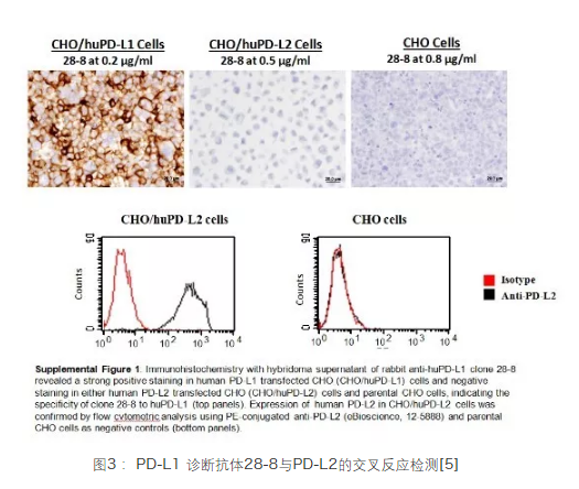 如图3所示:无论是IHC检测还是流式检测,PD-L1诊断抗体28-8与PD-L2并无交叉反应,呈现出高特异性[5]。