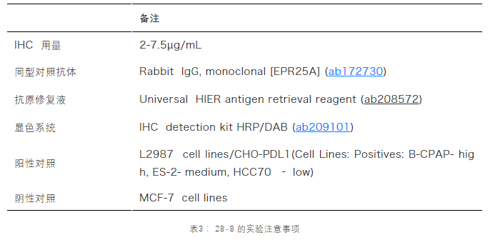 如表1所示,PD-L1[28-8]作为PD抑制剂的补充诊断抗体,已经获得了FDA批准用于NSCLC和黑色素瘤患者的临床诊断[3],具有特异性(经KO验证)、具有高灵敏性(兔单抗RabMab)、高重复性(重组抗体)等优点。