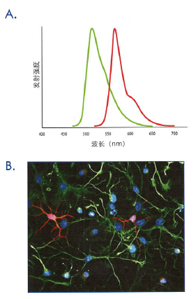 R&D Systems的 NorthernLights 荧光色素有着不重叠的光谱性质,非常适合多色IHC和ICC。A. NorthernLights-493 anti-goat igG(货号 NL003:绿色)和 NorthernLights-557 anti-mouse IgG(货号 NL007:红色)的发射曲线。B. 利用 anti-rat Nestin 亲和纯化的多克隆抗体(货号 AF2736:绿色)和 anti-neuron specific beta-III Tubulin 单克隆抗体(克隆号 TUJ-1)(货号 MAB1195:红色)多色检测大鼠皮层干细胞中的 Nestin和 beta-III Tubulin。细胞经过NorthernLights-493(货号 NL003:绿色)和 NorthernLights-557(货号 NL007:红色)二抗染色,并经 DAPI(蓝色)复染。