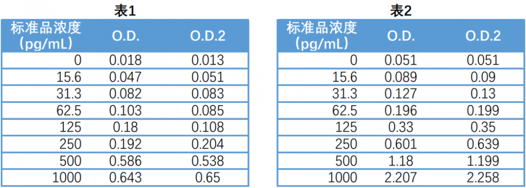 结果显示,最高浓度(1,000 pg/mL)的标准品平均 OD 值仅为 0.647,且 125pg/mL 标准品两个复孔 OD 值相差较大,低浓度标准品 OD 值无明显梯度。因而无法保证检测结果的准确性。而在使用了摇床的实验中,标准品 OD 值正常(表 2)。