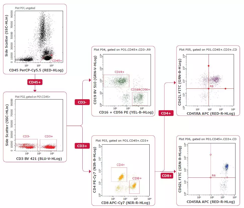 如图所示,T、B、NK各细胞亚群清晰可见,并可对各细胞亚群进行绝对计数,提供准确检测结果。