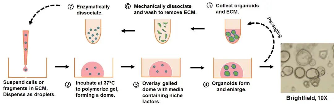 嵌入式3D“穹顶”类器官培养工作流程。单个细胞或类器官片段嵌入液体细胞外基质(ECM)中,并作为小液滴分配到预热的组织培养塑料容器的表面上。在37°C下培养后,ECM将固化为一个整体,形成“穹顶”凝胶,然后可用培养基覆盖。类器官将在穹顶内形成3D结构。