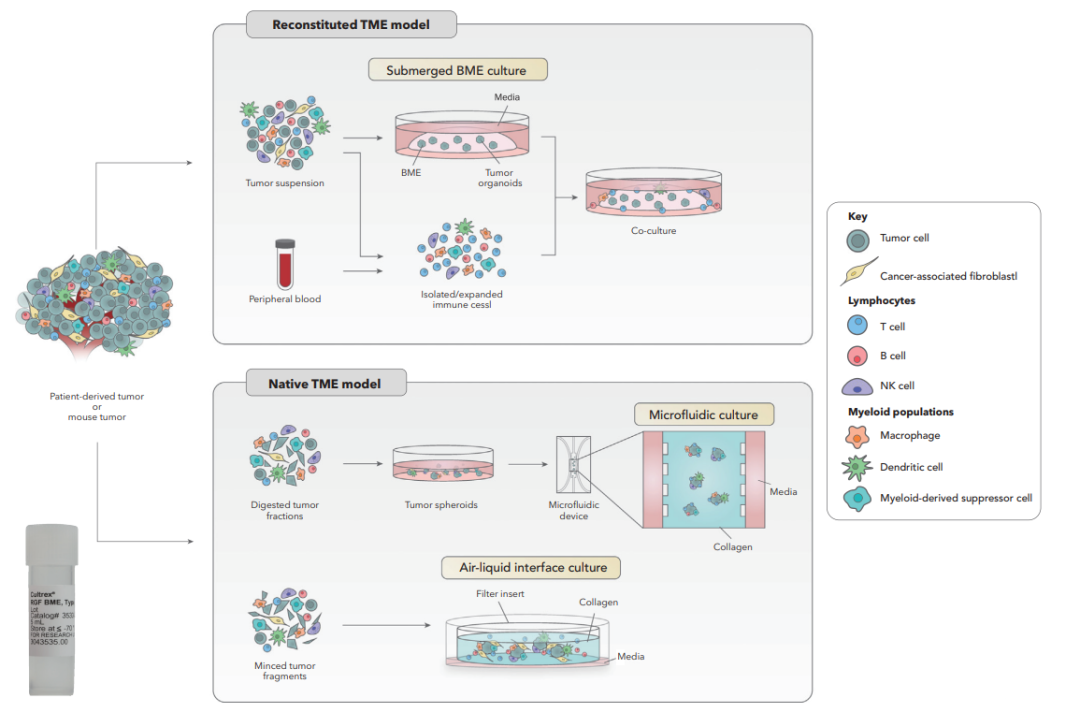 不论是肿瘤来源的球状体还是类器官,都可以用于研究 TME。主要分为组合 TME 模型和天然 TME 模型两种,主要区别在于前者是向培养的肿瘤类器官中添加免疫细胞,后者是直接培养天然的免疫细胞和肿瘤细胞。