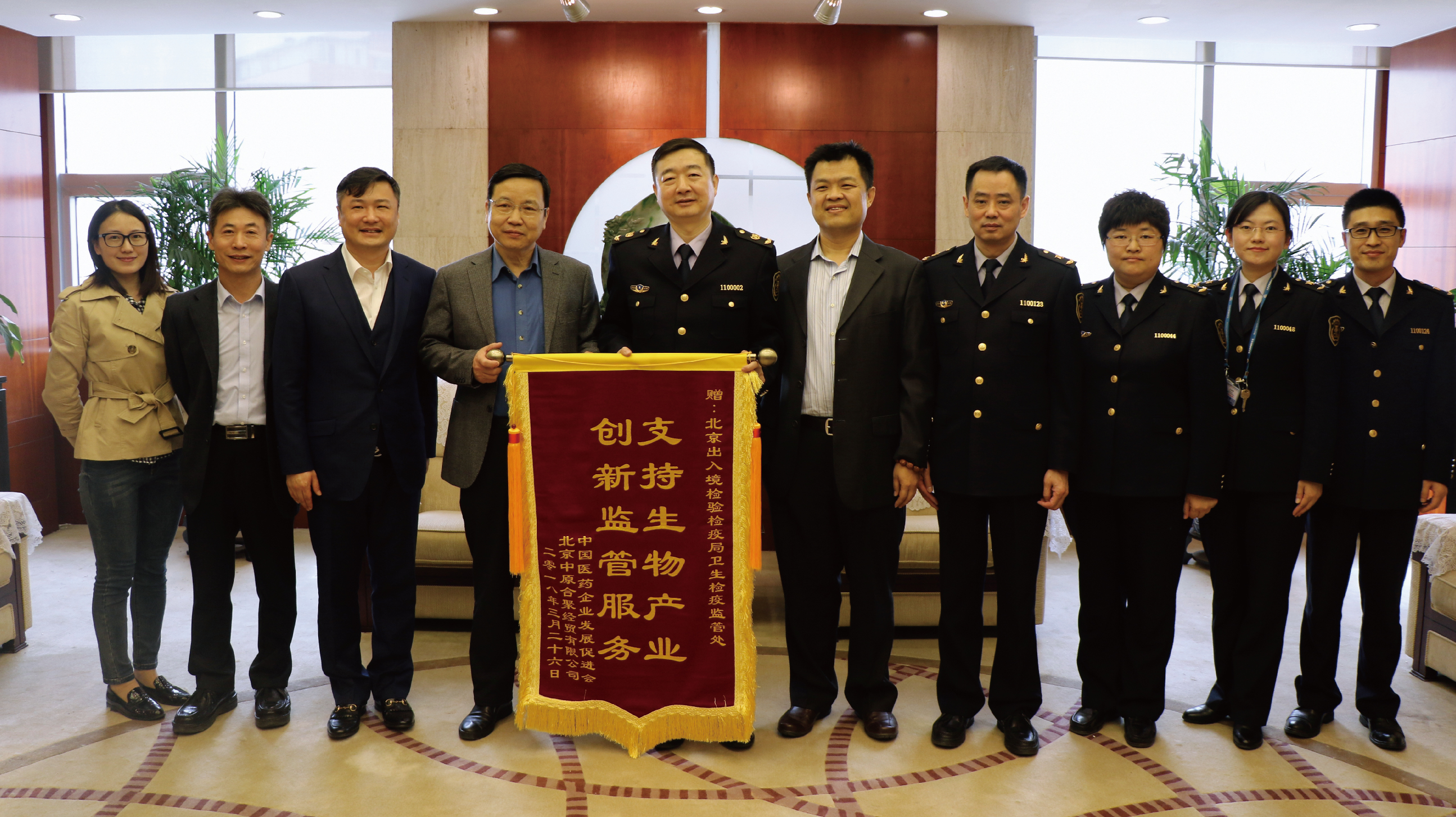 On March 28, 2018, Yao Tongli, Vice President of China Pharmaceutical Enterprise Development Promotion Association, and Zhu Xiaoyong, President of Zhongyuan Company, and Li Zhigang, Vice President, presented the banner to the Health Supervision Office of Beijing Entry-Exit Inspection and Quarantine Bureau.2018-04-02 11:40:00.0