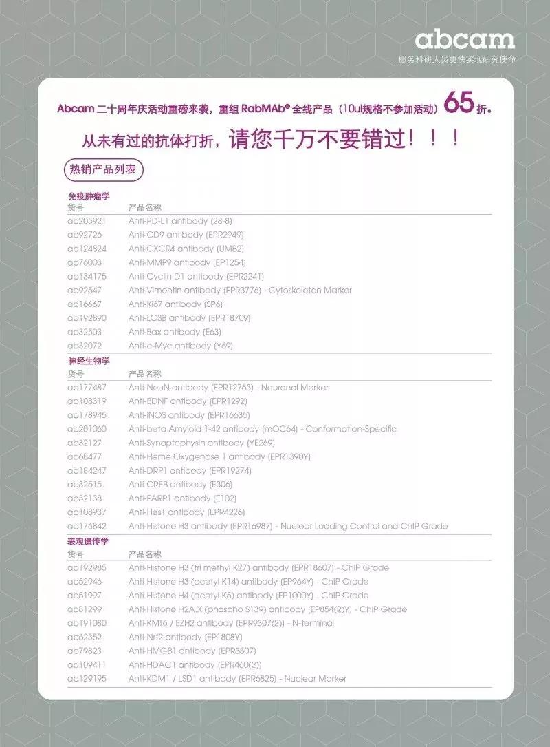 The second wave of Abcam's 20th Anniversary is in full swing. In order to give back to the new and old users who have long supported Abcam, the RabMAb® (abcam patented rabbit monoclonal antibody) will be reorganized as low as 65% (except for 10ul in small packages)! The decline has never been seen before! Help accelerate your scientific discovery!