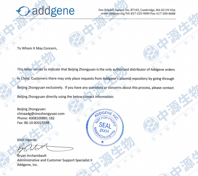 Addgene指定华体会体育平台-华体会(中国) 为其中国大陆独家授权代理商,授权可在Addgene官方网站 上查询确认。