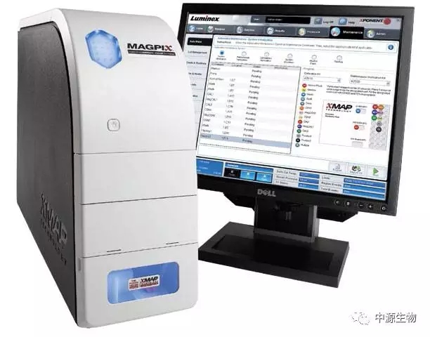 Luminex 技术应用微球和流式细胞仪的原理。微球内部含有两种不同颜色的免疫荧光,通过荧光不同的比例可以区分多达100种不同的微球。每种微球可以用来检测一种不同的蛋白或基因。因此,利用微球技术可以同时检测高达100个蛋白。该技术利用荧光编码的微球共价交联单克隆抗体,与被测定的目标分子结合后,加入荧光素标记的检测抗体,再通过激光扫描荧光编码来识别单个微球和测量“检测荧光”强度来确定被测分子的浓度。