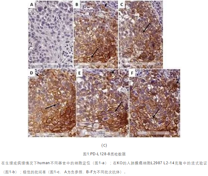 在生理或病理情况下human不同器官中的细胞定位(图1-a);在KO的人肺腺癌细胞L2987 L2-14克隆中的流式验证(图1-b);极低的批间差(图1-c, A为负参照,B-F为不同批次抗体)。