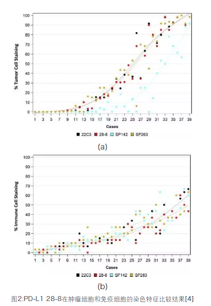 对20名NSCLC和20名黑色素瘤患者的TC和IC的IHC检测结果显示:相对于E1L3N,28-8是一个更优秀的伴随诊断抗体[3]。