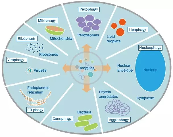 自噬是将大分子和细胞器转运至溶酶体,使其降解和回收再利用的过程。这一过程的目标是消除过量或有缺陷的细胞器以及聚集的衰老蛋白。在水解之后,基本的分子原件被回收到细胞质中,作为细胞的组成材料或能量来源。因此,自噬在细胞内稳态机制中起着关键作用,控制着细胞的可用资源和能源消耗之间的平衡。