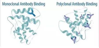 抗体结合往往依赖于目标蛋白维持其天然的构象状态。与其他蛋白的相互作用、翻译后修饰、温度、pH、固定和盐浓度都会影响抗体接近目的表位。多克隆抗体是异质的,可识别多个表位,因此它们较少受到蛋白构象变化的影响。一般而言,多克隆抗体在一定pH和盐浓度范围内也比单克隆抗体更为稳定。基于这些原因,多克隆抗体更常用于IHC/ICC实验。