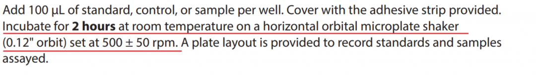 由于说明书中指定的轨道直径 3 mm,转速 500±50 rpm 的摇床是我们验证过的能保证准确结果的摇床,而其它摇床,如 Western Blot 实验中使用的水平摇床轨道直径较大,如果设置成 500rpm 就会转速太快,容易造成微孔板内液体飞溅、样品孔污染,进而影响实验结果的准确性。