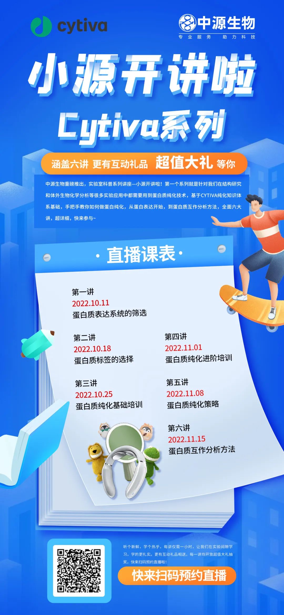 联合Cytiva重磅推出蛋白纯化系列课程直播讲座,全程六讲,从最基础的表达系统筛选,到蛋白纯化策略,乃至蛋白质分析方法,全方位学习蛋白质研究的方方面面。