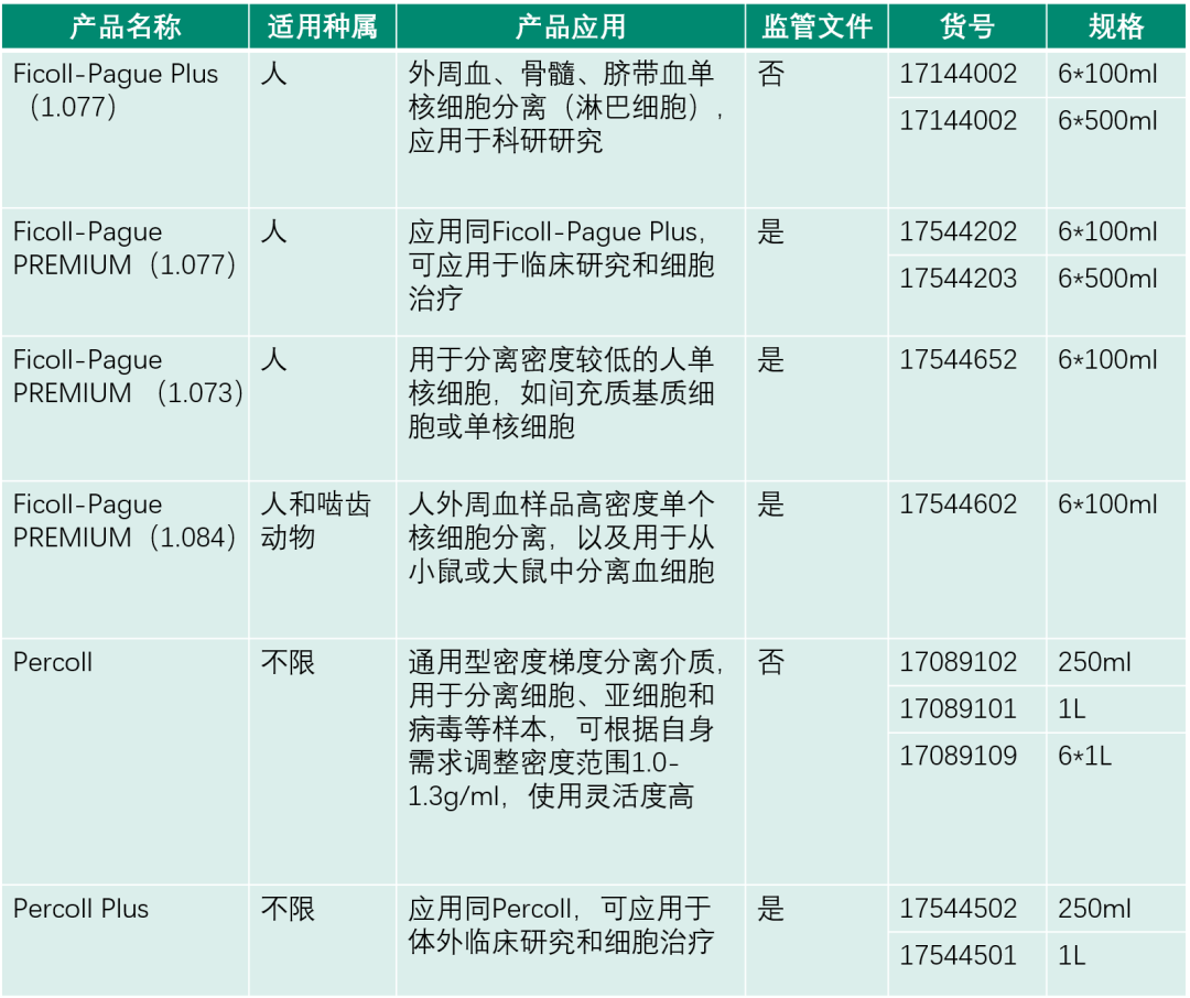 三种密度可选,1.073,1.077,1.084 g/ml,适用于从外周血、骨髓和脐带血中制备不同密度的人单个核细胞