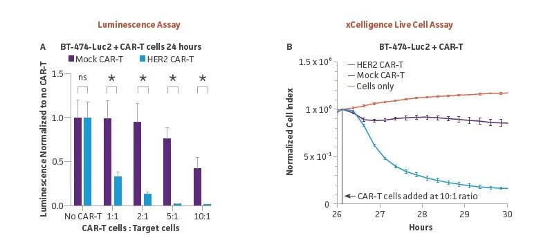 图3:HER2 CAR-T对BT-474-Luc2的体外杀伤力检测,使用发光法和xCelligence测量。(A) 将HER2阳性的BT-474-Luc2细胞(5 x 103)接种到96孔板中,作为同一供体的HER2 CAR-T或Mock CAR-T(对照)的靶细胞,CAR-T细胞与靶BT-474-Luc2细胞分别以不同的比例(1:1,2:1,5:1,10:1)接种。在共培养24小时后,将Bright-Glo加入到指定的孔中。使用发光板阅读器在10分钟内读取板的发光情况,确定HER2 CAR-T细胞具有剂量依赖性的特异性杀伤力,大于用模拟CAR-T细胞观察到的非特异性杀伤力(*=差异明显,ns=差异不明显,使用非配对t检验,单一的集合方差)。(B)HER2 CAR-T细胞以10:1的比例针对2×10⁴HER2阳性的BT-474-Luc2,用xCELLigence系统测量细胞杀伤力。来自同一供体的模拟CAR-T细胞被用作对照。