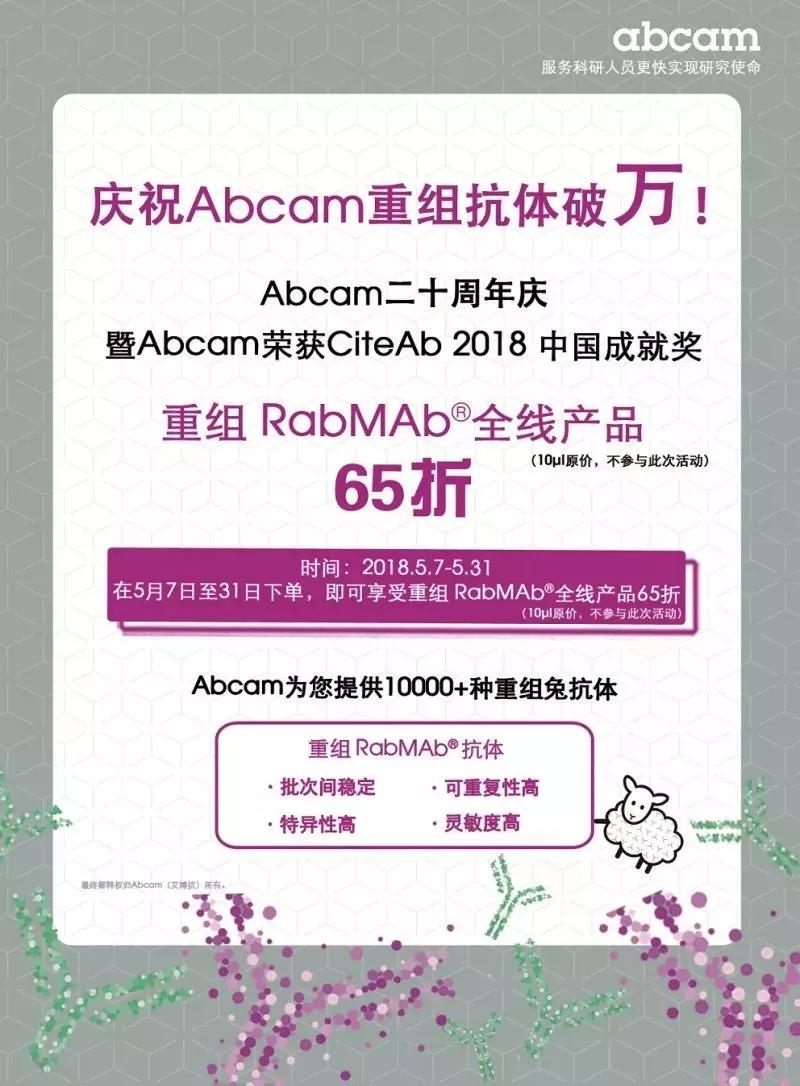 The second wave of Abcam's 20th Anniversary is in full swing. In order to give back to the new and old users who have long supported Abcam, the RabMAb® (abcam patented rabbit monoclonal antibody) will be reorganized as low as 65% (except for 10ul in small packages)! The decline has never been seen before! Help accelerate your scientific discovery!